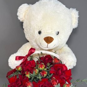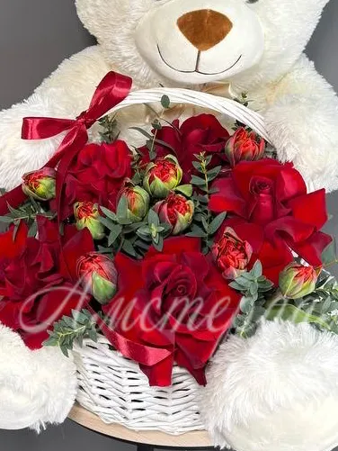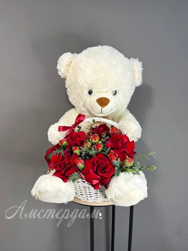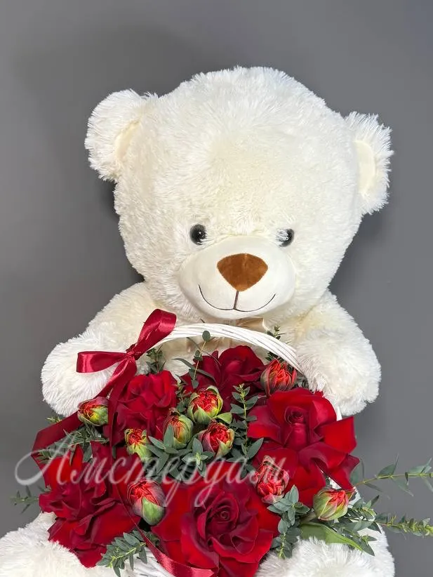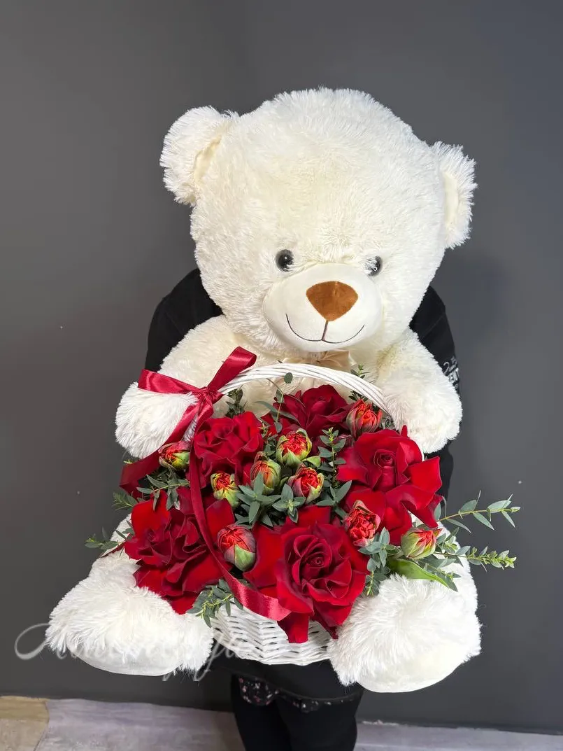 Подарите своим близким уют и нежность с этим очаровательным набором — мягким медведем и стильной корзиной с свежими цветами. Медведь ростом 100 см станет символом тепла и заботы, создавая особую атмосферу уюта. В корзине разместились восхитительные тюльпаны и французские розы, дополненные ароматным эвкалиптом и оазисами, сохраняющими свежесть цветов. Размер корзины 28x11 см идеально подходит для подарка или декорации интерьера. Такой букет станет прекрасным выражением любви и внимания, подчеркивая вашу искренность. Позвольте себе удивить и порадовать близких этим изысканным и трогательным подарком.