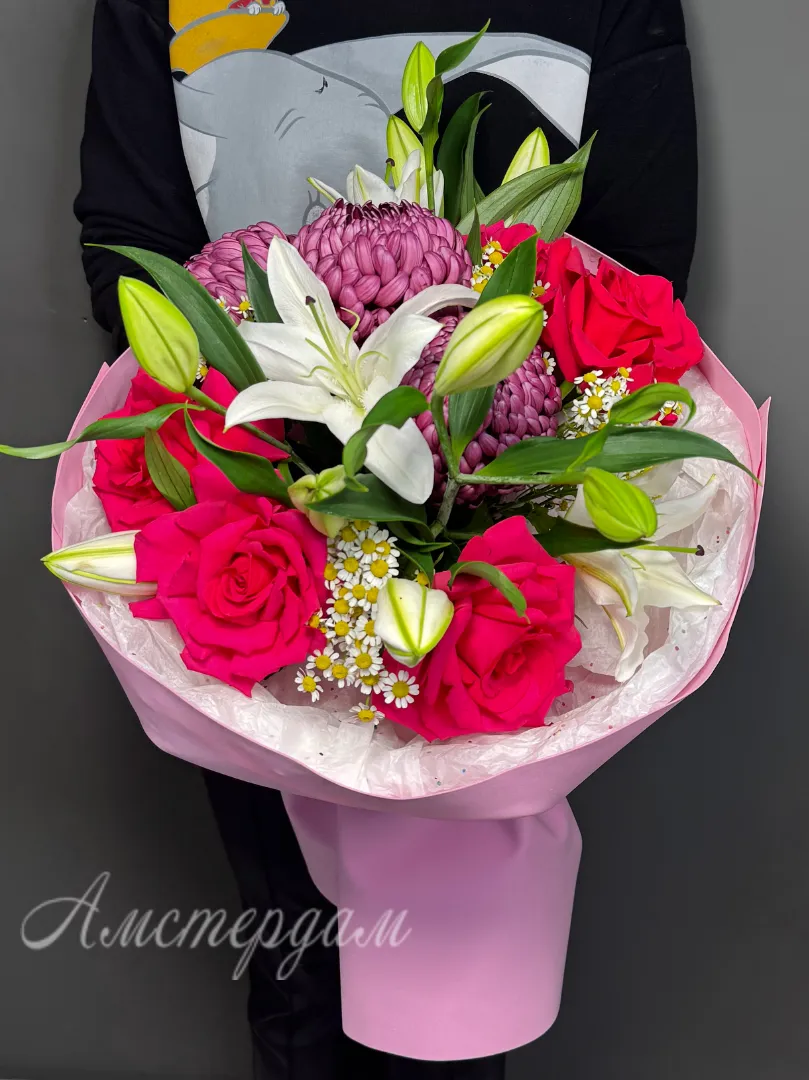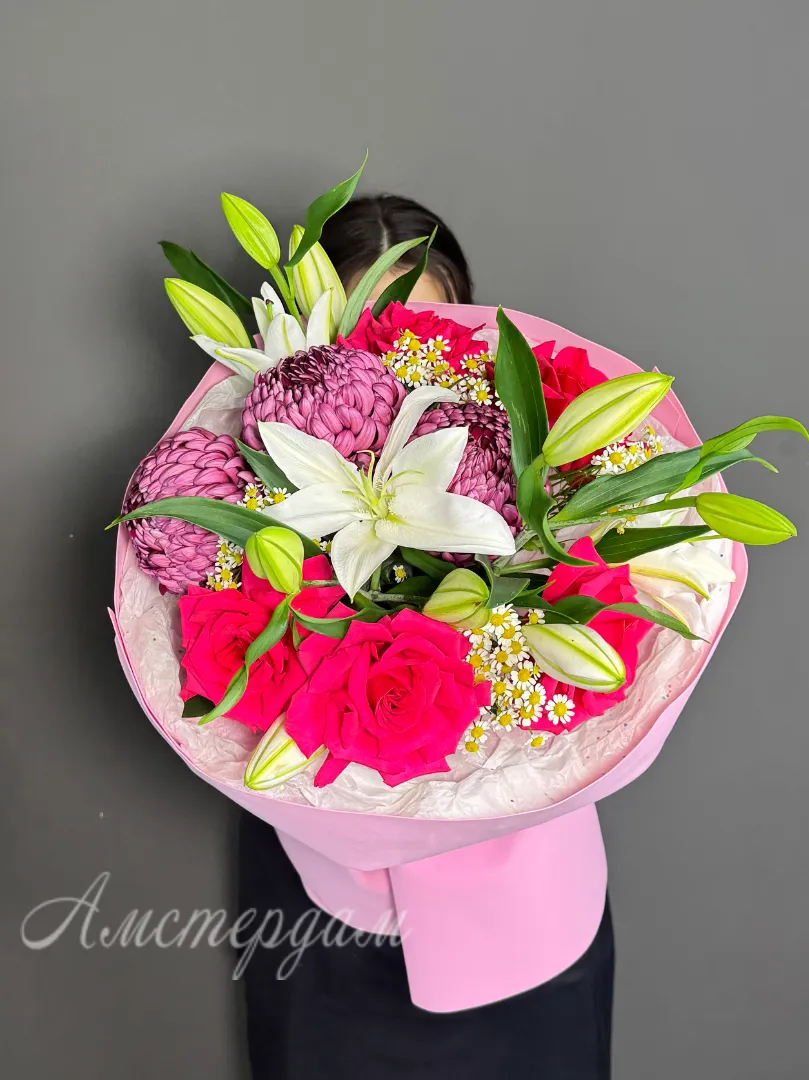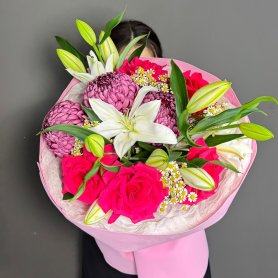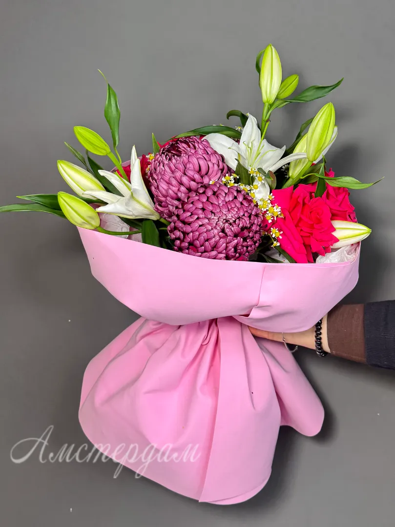 Букет с лилиями, французскими розами, хризантема бигуди и танацетумом