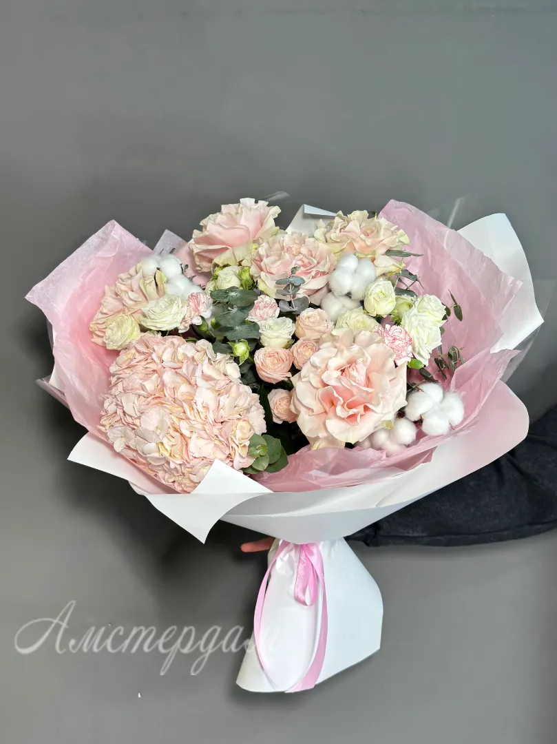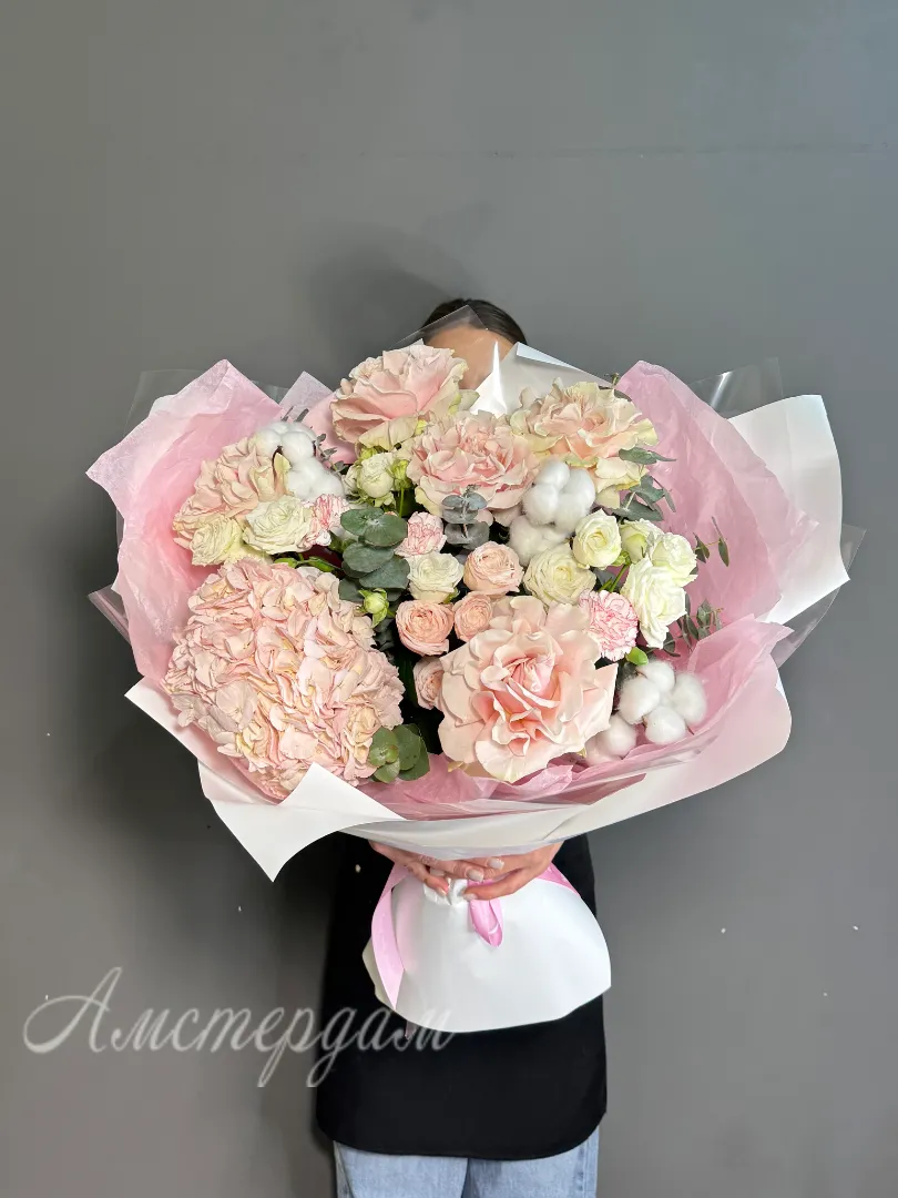 Букет гигант с французскими розами, гортензией кустовыми розами