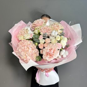 Букет гигант с французскими розами — это поистине роскошное и яркое цветочное украшение. В состав входят внушительные французские розы, создающие элегантное настроение, а гортензия добавляет объема и мягкости композиции. В букет также включены гвоздика кустовая, эвкалипт и хлопок, придающие ему текстурность и свежесть. Кустовые розы и свежий упаковочный материал завершают образ, делая букет по-настоящему исключительным. Такой букет станет ярким акцентом любого интерьера или прекрасным подарком для близких.