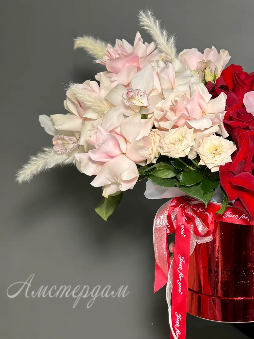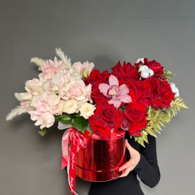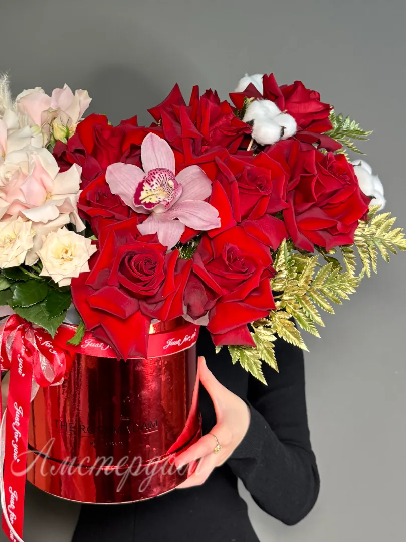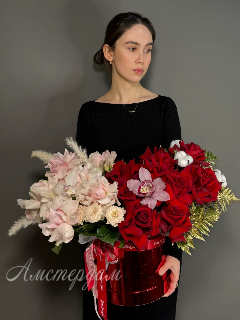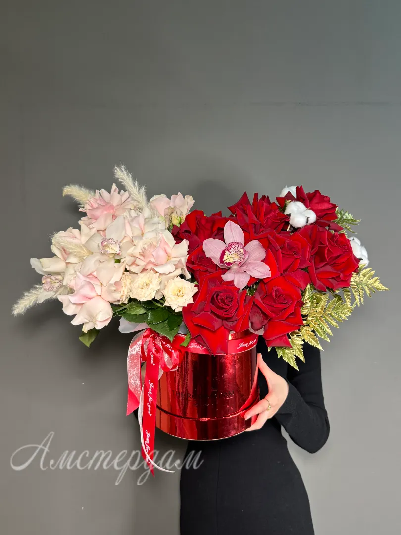 Роскошная коробка из французских роз с орхидеями и кустовыми розами