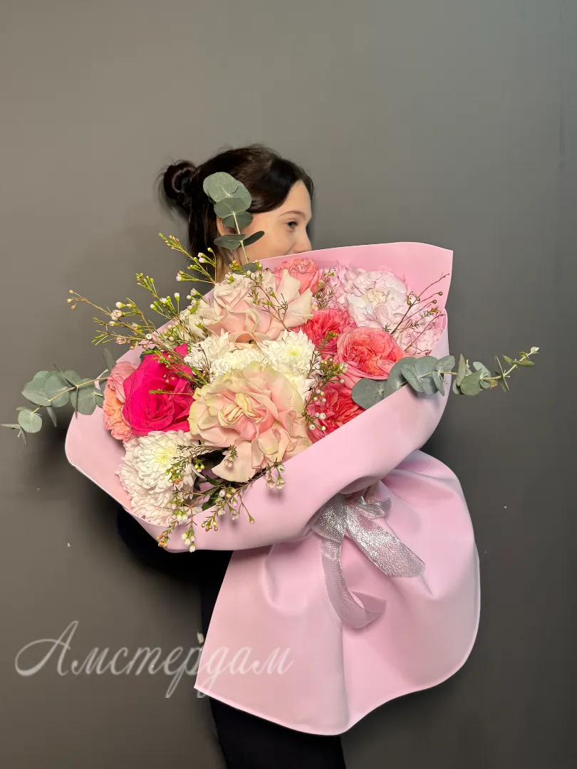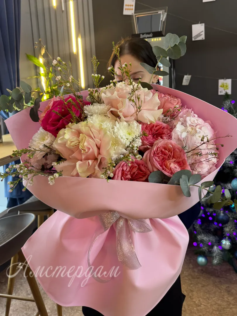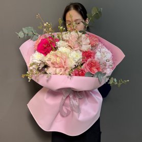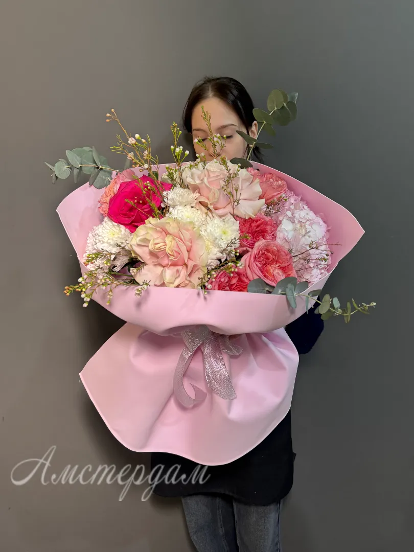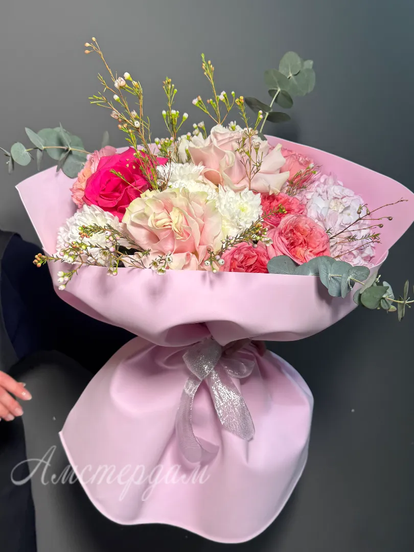 Роскошный букет с премиальными розами — это истинное произведение искусства флористики. В его составе гармонично сочетаются изящные французские розы и пионовидные розы, создавая эффектный акцент. Дополняет композицию хмелевидный хамелацум и пышная гортензия, добавляя объема и текстуры. Эвкалипт придает свежесть и утонченность, а аккуратная упаковка подчеркивает премиальность букета. Такой букет станет великолепным подарком для особого случая или украшением важного события.
